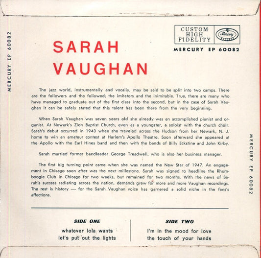 Sarah Vaughan - Whatever Lola Wants (7", EP)