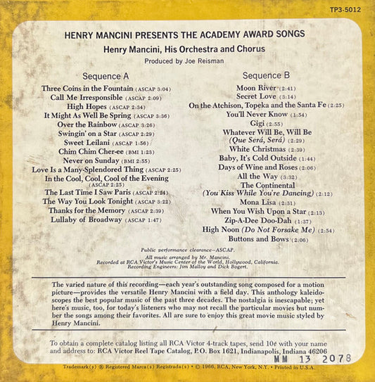 Henry Mancini And His Orchestra And Chorus - Henry Mancini Presents The Academy Award Songs (Reel, 4tr Stereo, 7" Reel)