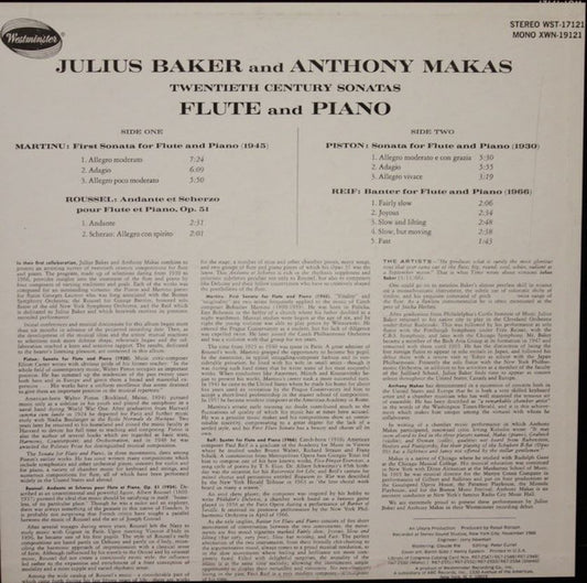 Walter Piston, Bohuslav Martinu*, Paul Reif, Albert Roussel, Julius Baker, Anthony Makas - Twentieth Century Sonatas (LP, Mono)