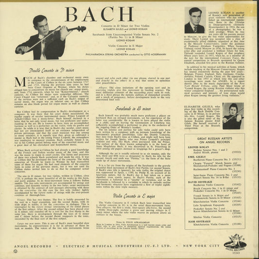 Leonid Kogan And The Philharmonia Orchestra Conducted By Otto Ackermann , With Elisabeth Gilels In The Double Concerto. J.S. Bach* - Leonid Kogan Plays Bach (LP, Album, Mono)