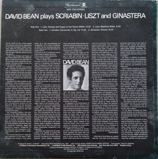 David Bean Plays Liszt*, Scriabin*, Ginastera* - Plays Liszt, Scriabin and Ginastera (LP)