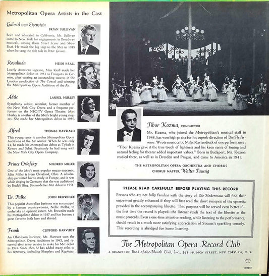 Johann Strauss Jr. : Tibor Kozma, The Metropolitan Opera House Orchestra And Metropolitan Opera Chorus - Die Fledermaus (LP, Mono)