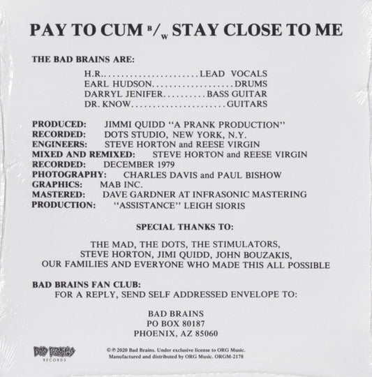 Bad Brains - Pay To Cum! (7", Single, RE, RM)