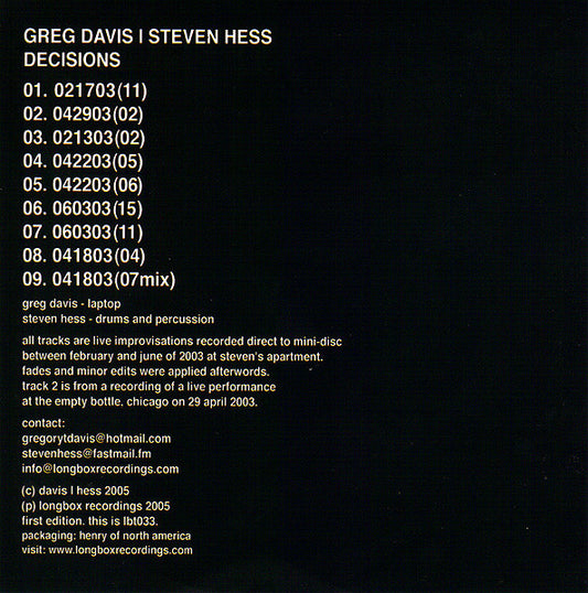 Greg Davis | Steven Hess - Decisions (CD, Ltd)