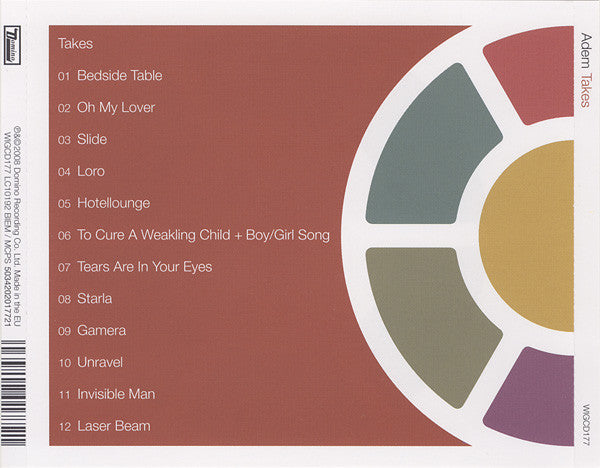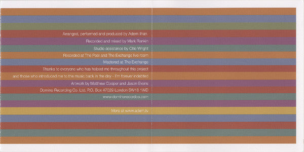 "Adem's third full length album featuring versions of songs by Björk, Smashing Pumpkins, Aphex Twin, Low, PJ Harvey and more" Track 1: Original by [a119765 (from [r=469956 7" - 1992 + additional music from "The Rest Of The Day" (from 65084 - 1996) Track 2: Original by [a36052 (from 52561 - 1992) Track 3: Original by [a1453 (from 6109 - 1998) Track 4: Original by [a84920 (from 302964 - 1998) Track 5: Original by [a74984 (from 102726 - 1994) Track 6: Originals by [a45 (from Richard D. James - 1996) Track 7: Original by [a50984 (from And Nothing Turned Itself Inside Out - 2000) Track 8: Original by Smashing Pumpkins (from 48703 7" b-side - 1992) + additional lyrics from "Window Paine" (from 48660 - 1991) Track 9: Original by [a4727 (from Gamera 12" - 1995) Track 10: Original by [a1373 (from 2815 - 1997) Track 11: Original by [a39778 (from 20764 - 1993) Track 12: Original by [a10824 (from 9357 - 2001) Contains 12-page booklet. Track durations do not appear on release. Recorded at The Pool and The Exchange live room. Mastered at The Exchange. ℗&© 2008 Domino Recording Co. Ltd. Made in the EU. Publishers: Track 1: Bedhead Songs Track 2: Hot Head Music / EMI Music Publ. Ltd. Track 3: Emotional Wrench / Door Number One Music / Universal Songs Of Polygram Inc. Track 4: Strictly Confidential (UK) Ltd. Track 5: Bang Prods-Great America / Rondor Music (London) Ltd. Track 6: Chrysalis Music Ltd. Track 7: Warner Chappell-Artemis Music / Excellent Classical Songs Track 8: Universal/MCA Music Ltd. Track 9: Wrapped In Rubber Music / Rough Trade Publ. Ltd. Track 10: Universal Music Publ. Ltd. Track 11: Copyright Control Track 12: 1238 Music