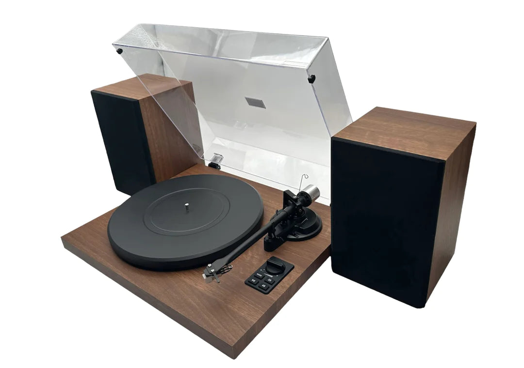The AccuTRAK CS -59 Bluetooth Turntable / speaker system matches a great pair of 50 Watt powered speakers with a fantastic belt drive turntable. The turntable includes, adjustable tracking weight, automatic anti skate, tone arm cueing and 33/45 speed control. The Bluetooth interface allows you to play your favorite streaming service though the powered speaker system. Great system for those just jumping into vinyl and looking for a Taylor Swift fix.