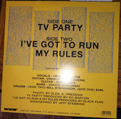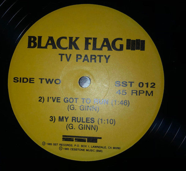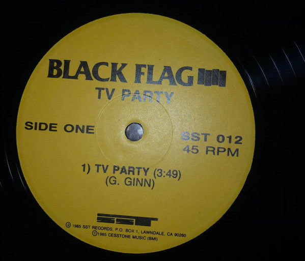 Almost identical to [r=472900, but there is no "PRINTED IN CANADA" above the barcode. Less space between the picture and "TV PARTY" text. Different version of 'TV Party' to the one found on '28654' (SST 007) ℗ 1985 SST Records, P.O. Box 1, Lawndale, CA 90260 © 1985 Cesstone Music (BMI) Probably pressed after 2000.