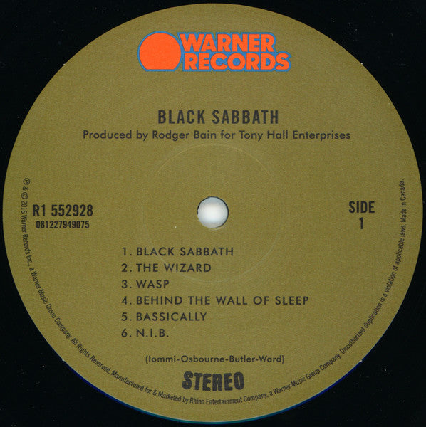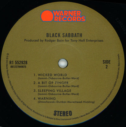 Similar to [r28245346 except jacket cover has STEREO 1871 printed top right corner, different catalog numbers on labels and Hype sticker different. Hype Sticker on plastic wrap: Deluxe 2LP 180 Gram Vinyl features the classics "Black Sabbath" & "N.I.B." plus an ENTIRE LP of bonus material available for the first time on vinyl R1-552928 † 081227949075 All tracks published by Westminster Music Ltd., except Black Sabbath and The Wizard, published by Onward Music Ltd. Evil Woman published by EMI Publishing Ltd. & Warning published by Getaway Music Ltd. Produced by Roger Bain of Tuesday Productions, for Tony Hall Enterprises. ℗ & © 2016 Warner Bros. Records, Inc., a Warner Music Group Company. Record two tracks C2 to D5 previously unreleased in North America. Track D5 is credited as "Moreshed" on the gatefold artwork and "Moreshead" on the Side D label. Runouts are stamped, except "R1-552928 A1/B1/C1/D1" strings and i...i, i..i, which are etched.