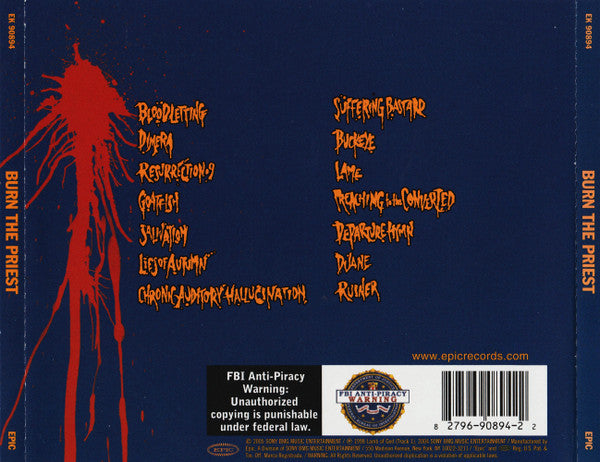 Reissue of Burn The Priest. It contains a video for Bloodletting, recorded live on the Killadelphia DVD by Lamb Of God. The last two tracks were originally all one track, with Ruiner being a hidden track on Duane. But in the reissue, they split them up into two separate songs. Recorded November 10 -14, 1998 at Austin Enterprises in Clinton, Mass. Originally mastered at M Works. Mastered at Sony Music Studios in New York. Mixed at Chapel Studio in England. Originally released on Legion Records. All songs copyright 2005 Sony / ATV Songs LLC / Subtle Arts of Publishing (BMI). All rights administered by Sony / ATV Music Publishing 8 Music Square West, Nashville, TN 37203. All rights reserved. Used with permission.