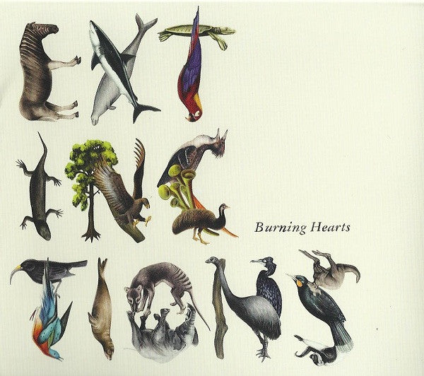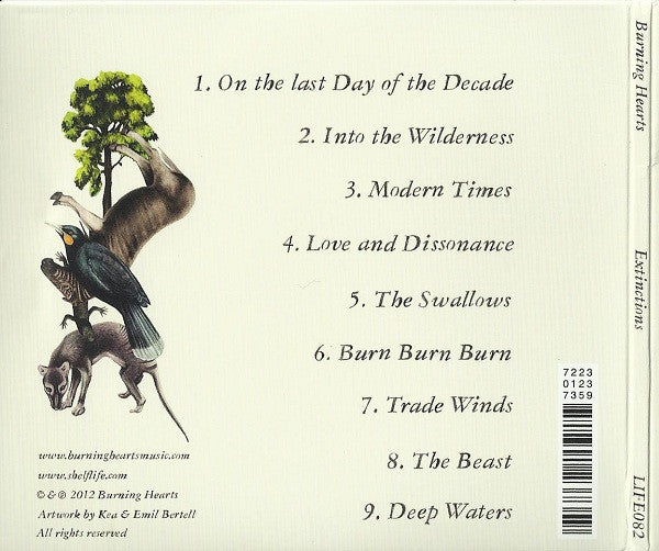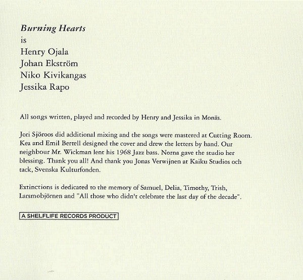 Burning Hearts is Henry Ojala, Johan Ekström, Niko Kivikangas, Jessika Rapo. All songs written, played and recorded in Monäs. Mastered at Cutting Room. Extinctions is dedicated to the memory of Samuel, Delia, Timothy, Trish, Larsmobjörnen and "All those who didn't celebrate the last day of the decade". In tri-fold cardboard packaging.