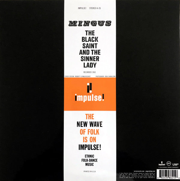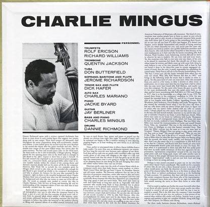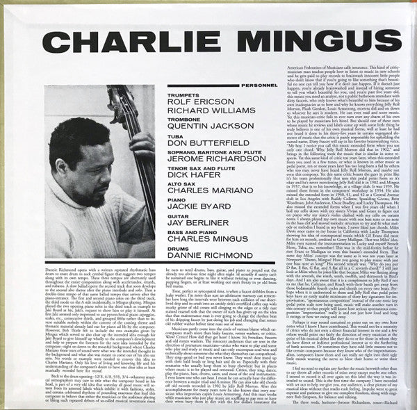 Issued in glossy laminated gatefold jacket with Acoustic Sounds Series insert. Hype sticker (catalog # STDDACOUST) affixed to outer bag: Acoustic Sounds Series Audiophile Vinyl Reissues From The World's Greatest Jazz Labels Mastered from the original analog tapes by top mastering engineers Manufactured at Quality Record Pressings (QRP) on 180 gram vinyl Gatefold sleeves printed at Stoughton Printing Company Additional sticker: 60 impulse! STDIMP60LP Side B total time: 17:52 Artist on spine: Charles Mingus Artist inside gatefold: Charlie Mingus Track B3 (Mode F) title on gatefold: Group And Solo Dance (Of Love, Pain, and Passioned Revolt, then Farewell, My Beloved, 'til it's Freedom Day)