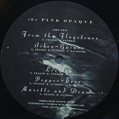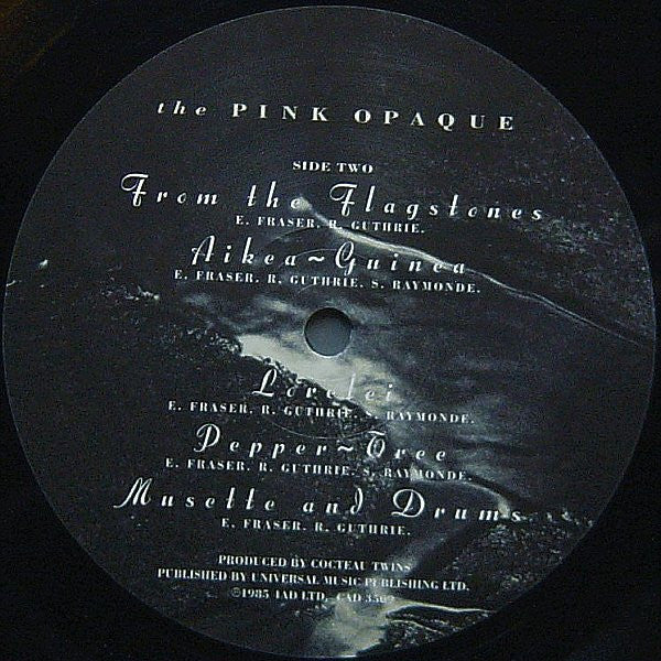 Sticker on shrink wrap: "Cocteau Twins The Pink Opaque --------------------------- Remastered From HD Audio Pressed On Audiophile 180 Gram Vinyl Includes MP3 Download CAD 3509" © 1985 4AD Ltd.