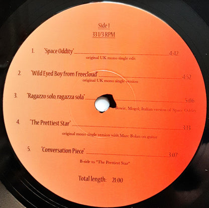 Title on spine: 1969-1973 Rarities Volume 1 On front cover: Stereo 1312 / Includes mono versions. Track A3: Italian version of "Space Oddity" Track A5: B-side to "Prettiest Star" Tracks B6 & B7: Single version split into two separate songs Track B8: Previously unreleased Track B10: Only ever issued on original '71 Mercury single Tracks sequentially listed on the back cover and labels. No etchings or stampings in the runouts.