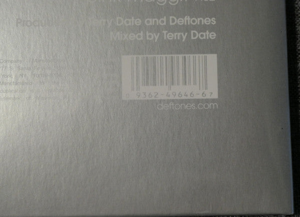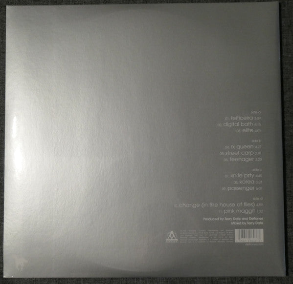Gatefold cover. Different from 2020 US version as it now says "Manufactured in the U.S.A." on back cover and the barcode is back to being silver similar to the 2010 release Maverick Recording Company. Manufactured and Distributed by Warner Records Inc. 777 S. Santa Fe Ave., Los Angeles, CA 90021; 1633 Broadway, New York, NY 10019-6708 ©℗ 2000 Maverick Recording Company. Manufactured in the U.S.A. All Rights Reserved. Unauthorized duplication is a violation of applicable laws. Maverick logo is a trademark of Maverick Recording Company. Sticker on the front: deftones white pony AVAILABLE FOR THE FIRST TIME IN TEN YEARS Double-LP set featuring "Change (In the House of Flies)," "Knife Prty," "Passenger" and more 093624964667 UPC is listed on spine as well