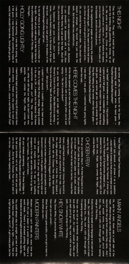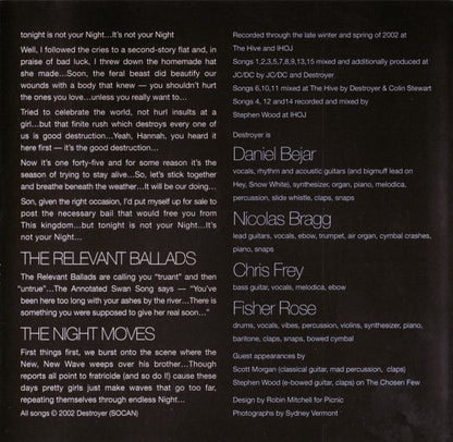 Recorded through the late winter and spring of 2002 at The Hive and IHOJ. Tracks 1 to 3, 5, 7 to 9, 13, 15 mixed and additionally produced at JC/DC. Tracks 6, 10, 11 mixed at The Hive. Tracks 4, 12, 14 recorded and mixed at IHOJ. All songs © 2002 Destroyer (SOCAN). Design for Picnic. Sticker: made in Canada