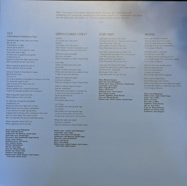 Made in Germany. Limited 180 gram repressing. Issued with printed inner sleeve with lyrics + credits, and black poly-lined sleeve. Track publishers: All songs © 1982 Freejunket Music ASCAP. Ruby Baby © 1955, 1963 Chappell & Co. Inc./Quintet Music, Inc./Bienstock Pub. Co. ASCAP All Rights adm. by Chappell & Co., Inc. (Intersong Music, Publishers). ©℗ 1982 Warner Bros. Records Inc. for the U.S. & WEA International Inc. for the world outside of the U.S. Track A1 title appears as "I.G.Y." on jacket and label. Recorded and mixed entirely on 3M digital 32 track and 4 track machines at Soundworks Digital Audio/Video Recording Studios, N.Y., Village Recorders, L.A. and Automated Sound, N.Y. Original Mastering: at Masterdisk, N.Y.C. Jeff Porcaro courtesy of Columbia Records Valerie Simpson courtesy of Capitol Records Greg Phillinganes courtesy of Planet Records "Note: The songs on this album represent certain fantasies that might have been entertained by a young man growing up in the remote suburbs of a northeastern city during the late fifties and early sixties, i.e., one of my general height, weight and build."