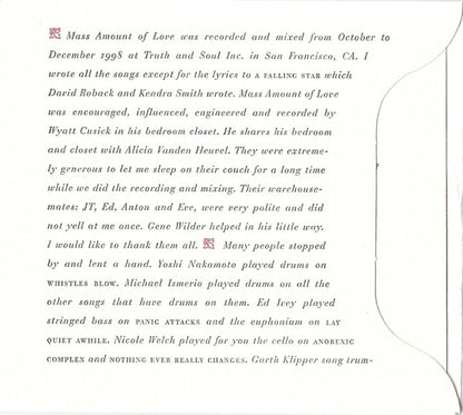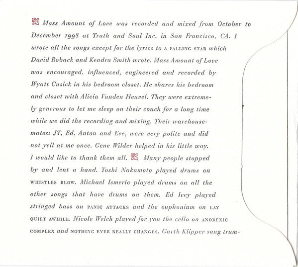 Mass Amounts Of Love 31:43 Comes in a gatefold digipak with an insert in the left pouch & cd in the right pouch.