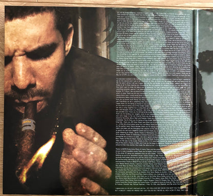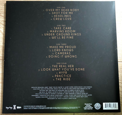 Inside cover incorrectly lists the deluxe edition bonus tracks ("The Motto Feat. Lil Wayne" & "Hate Sleeping Alone"), but neither song is actually on this release. The cat # is listed on the spine and the rear cover. 2LP housed in a gatefold sleeve. Track B1, Take Care, is incorrectly wriiten as just "Care" on back cover.. Track 1 contains elements of "Sailin' Da South" as performed by DJ Screw. Track 2 contains elements of "Anything" as performed by SWV. Track 5 contains elements of "I'll Take Care Of You." Track 7 contains elements of "Neck Of The Woods." Track 7 contains elements of "Duffle Bag Boy." Track 7 contains elements of "Farmers Pleasure" performed by Jah Cure. Track 7 contains elements of "Farmer's Pleasure (Loving This)" remix performed by Jah Cure, Trayon Garrett & Troy Azore. Track 11 contains elements of "Calling On You" performed by Jon B. Track 12 contains elements of "The Wrong Thing To Do." Track 12 contains elements of "If U Scared, Say U Scared." Track 12 contains samples from "If U Scared, Say U Scared" as performed by Playa. Track 15 contains elements of "Swanging And Banging" as performed by ESG. Track 16 contains elements of "Back That Azz Up." "MASTERED BY CAPITOL" is stamped into the runouts. Everything else is etched.