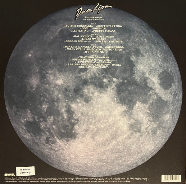 Expanded edition of 'Future Nostalgia'. Gatefold sleeve. A Warner Records UK Release ℗ & © 2021 Dua Lipa Limited under exclusive license to Warner Music UK Limited. Except tracks 3, 4, 5, 6, 7, 8, 9, 10, 11, 12, 18 ℗ 2020, tracks 1 & 2 ℗ 2018 Dua Lipa Limited under exclusive license to Warner Music UK Limited, track 14 ℗ 2020 RCA Records, a division of Sony Music Entertainment, track 19 ℗ 2020 Sueños Globales, LLC. Exclusively licensed to UMG Recordings Inc. ℗ Universal Music Latino/NEON16 Made in Germany.