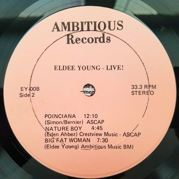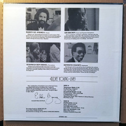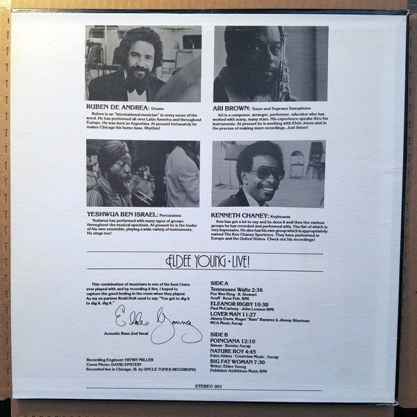 From back cover: "This Combination of musicians is one of the best I have ever played with and by recording it live, I hoped to capture the good feeling in the room when the played. As my ex-partner Redd Holt used to say: 'You got to dig it to dig it, dig it.' -Eldee Young" "Recorded live in Chicago, Ill., by UNCLE TUNES RECORDING"