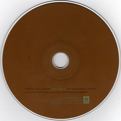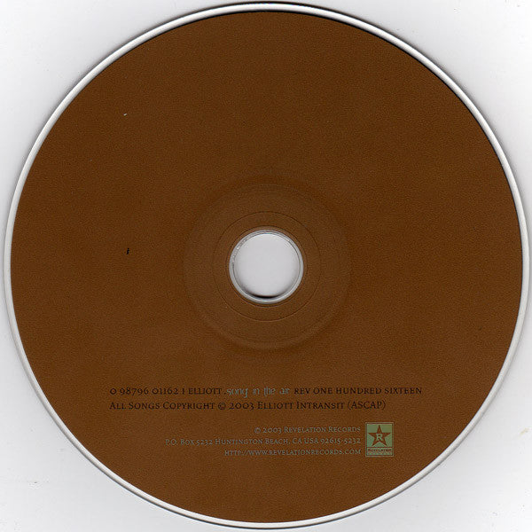 Standard jewel case in slipcase with clear tray & 14-page lyrics booklet with fold-out on first page. All songs © 2003 Elliott Intransit (ASCAP). Recorded and Mixed at Nonlinear Studios. Additional drum recording at VML Studios, Louisville KY. Album art inspired by and created from the work of Carrie Burr. For booking, contact Eva Alexiou at Fata Booking (EvaFata@aol.com). On CD: © 2003 Revelation Records P.O. Box 5232 Huntington Beach, CA USA 92615-5232 This recording ©℗ 2003 Revelation Records.