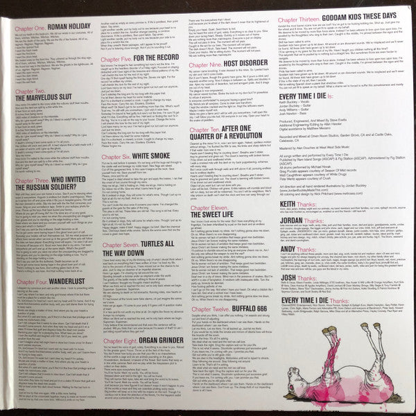 Produced, engineered, and mixed by Steve Evetts Additional engineering/editing by Allan Hessler Digital assistance by Matthew Mesiano Recorded and mixed at Omen Room Studios, Garden Grove, CA and at Castle Oaks, Calabasas, CA Mastered by Alan Douches at West West Side Music All songs written and performed by Every Time I Die Published by Ram Island Songs (ASCAP) & Fig Stallion (ASCAP). Administered by Fig Stallion (ASCAP). All drums performed by Michael Novak Greg Puciato appears courtesy of Season of Mist records Matt Caughthran appears courtesy of White Drugs Pete Wentz appears courtesy of Crush Art direction and all hand rendered illustrations by Jordan Buckley (www.JordanBuckleyMadeThis.com) All coloring and design by Nick Pritchard (www.metrosea.com)