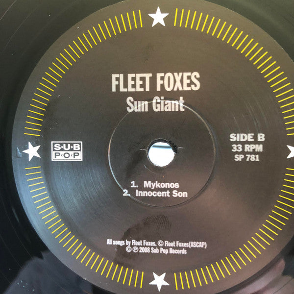 Identical in many ways to the original [r1359927 2008 release. However, a few packaging differences of note: 1. This copy has plastic sleeves for the records, whereas the original 2008 has paper. 2. Additionally, the spines are slightly different: The "Sub Pop" label at the top is smaller on this release than the original, "Fleet Foxes" is better centered in the middle, and "SP 777" is all the way at the bottom (the 2008 release has a cpl inches between the "SP 777" and the bottom). [See pictures Black vinyl. Matrix/Runout/Labels are all identical to original 2008 pressing. Comes with a download card. Released in a gatefold sleeve with the "Sun Giant" EP as a bonus. 2 printed inserts included. Fleet Foxes (LP): Recorded at our homes, our friends' homes, our parents' homes, at London Bridge Studio, and at Avast Studio in Seattle, Washington, through the Summer and Fall of 2007. Phil Ek produced, engineered, and mixed, except when we were flailing around at home, recording ourselves poorly for him to clean up later. This happened often. [... Mastered, at RFI in Seattle. Sun Giant (EP): We all played many an instrument. An itemized and individualized list would be egotistical and tiresome. It was mostly recorded in early January of 2008 at Bear Creek Studios in Woodinville, Washington. We did additional recording at both our house and at Stuart Hollerman's Avast! Studio, where the EP was also mixed. The handsome Philip M. Ek was the producer, engineer, and mixer. All hate mail may be directed to him. Except mastering hate mail, which can be sent to Ed Brooks at RFI in Seattle, WA. Cover painting "The Blue Cloak" (De Blauwe Huik) by Pieter The Elder Bruegel. © Staatliche Gemaldegaleria, Berlin, Germany / The Bridgman Art Library.