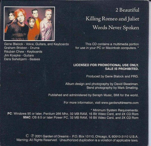 [On back Published and administered by Seraph Music, BMI for the world. ©℗ 2001 Garden of Dreams This CD contains a multimedia portion for use in your PC or Macintosh computers.