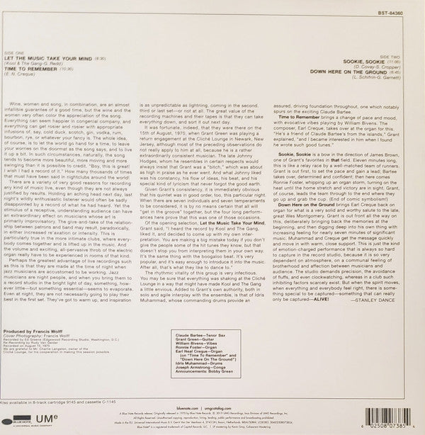 Recorded at the Cliché Lounge, Newark, N.J., August 15, 1970 BST-84360 on back cover and spine BST 84360 on label Some copies have a "Made in Germany" sticker on shrink wrap.