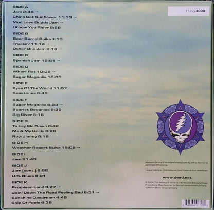 "Wall Of Sound" shows. Hand-numbered pressing of 3,000 in a two-piece hardshell box includes a two-sided color insert with photos and credits. Track A3 is called "Mud Love Buddy Jam" on the rear, and "Mind Left Body Jam" on the insert. ℗ 1974. This Reissue ℗ 1974, © 1974 & 2024 Grateful Dead Productions, Inc. Runouts are etched, except WELL MADE MUSIC is stamped.