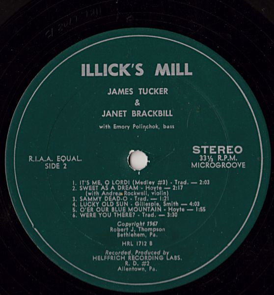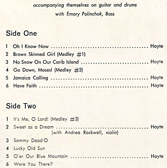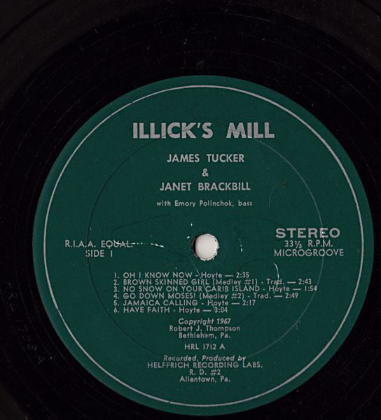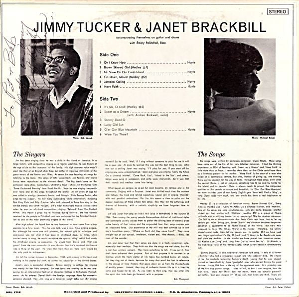 "Illick's Mill" on cover and record label. ...not sure of how many of these records are still around.... Helffrich Recording Labs has been defunct for many years. Back Cover Liner Notes: "The Singers" Jim has been singing since he was a child in the island of Jamaica. In a large family, with competitive singing as a regular pasttime, he was known at the age of six as the 'screamer' of the family. Hish high soprano voice wasn't used like that of an English choir boy, but rather in vigorous immitation of the great tenors of the forties and fifties. At seven Jim was learning his songs by listening to the radio. The songs of John McCormack, Jan Pearce, and Mario Lanza were reproduced to the minutest detail. The big break came on the Jamaican readio show "Lannaman's Children's Hour," where Jim triumphed with "Some Enchanted Evening" from South Pacific. Soon he was singing frequently over radio and on the stage throughout the island. At ten years of age he was called a prodigy, Jamaica's Lanza, and fittingly, 'little Tommy Tucker who sings for his supper.' He met many outstanding world entertainers, including Nat King Cole and Billy Eckstine (who both planned to have him sing in the United States) and Sarah Vaughan. Jim's most memorable musical success came when he won an all-island competition, singing 'Beloved' from The Student Prince. This meant a prize trip to Trinidad during carnival. He was warmly received by the people of Trinidad, and was acclaimed by the Trinidad Guardian as one of the most promising singers in the world. After high school Jim found that he was fortunate to have come from a boy soprano to a lyric tenor. This, he was told, was a rare thing among singers. But although his voice was still pleasant, his natural gift in technique and expression was not what it had been in childhood days. At times, when carried away in song, he would recapture the special 'thing' which had made his childhood singing so appealing. He would hear 'Bravo' and 'That was great!' from the next room -- but it was obvious that Jim's boyhood confidence was a thing of the past. He knew that from then on, hard work would be the only path to achievement. Jim left his native Jamaica in September, 1963, with a song in his heart and nothing in his pocket but faith, to further his education in the United States. Janet's story is somewhat different. Before coming to college her singing was mostly for her little campers. Jim met Janet one evening as he was preparing for an international festival at Moravian College in Bethlehem, Pennsylvania. As he entered Clewell Hall -- the foreign language dorm for women -- someone shouted, 'Hey, Jim, sing us a Jamaican song!' Who isn't shy among women? So he said, 'Well, if I sing without someone to play for me it will be a poor job.' At once he learned this was not the best thing to say. Who else but a smiling Janet saying, "I'll play for you, if you start off by singing one verse unaccompanied." Soon everyone was singing 'Carry Me Ackee Go a Linstead Market,' 'Come Back, Liza,' 'Island in the Sun,' and others. Songs were sung in succession, and some were interwoven. So it was that their rounds and medleys came into being. What began on campus as co-ed fun soon became, on campus and in the community, Singing with a Purpose. Janet was thrilled each time the mothers and fathers, the tired and retired executives, would join in singing 'Matilda' with real youthful enthusiasm. For Jim this meant a time to point out the deeper meanings of these simple folk songs -- how they tell the sufferings and dreams of humanity, with a melodic simplicity we have forgotten how to cherish. Jim and Janet first sang at Illick's Mill (also in Bethlehem) in the autumn of 1966. Even among the young people there -- whose distrust of traditional styles and sentiments usually causes them to prefer the driving beat of electric blues -- the beauty of their voices and the unguarded love their songs express was an irresistible force. Our experience at the Mill was best summed up in one boy's breathless query: "Where on Earth did they come from?" They came straight out of our cynical, intolerant, violent era. And therein, I think, lies most of the wonder. Jim and Janet feel that their songs are done in a fresh, uncommon style, especially their medleys. They think too that the songs are well done, but this is not their primary concern. They have something to tell. If you get it, they shall have achieved their purpose. Part of that purpose is to awaken in us feelings which the hasty clatter of life today has numbed below all nature. Yet they sing not of ideals, because for many that word has lost its relevance in the deluge of false rhetoric that pours down on us from the thunderheads of earthly power. Instead, they sing of authentic human life as it is lived by some and hoped for by all. As you listen to them sing, may you enter into the spirit that bids them go forward, with a purpose. --Bob Thompson "The Songs" Six songs were written by Jamaican composer, Clyde Hoyte. These songs have come out of the life of this very talented Jamaican. I had the thrillling experience in 1954 of learning both 'Sweet as a Dream' and 'Have Faith' in little more than an hour. I recorded them then, so that Clyde could have them as a birthday present for his mother. 'Have Faith' is the story of a man who failed at a commercial venture, but who, instead of giving up, one evening threw out his despair for the way of faith. Throughout these songs, even when the central theme is not of Jamaica, something has to be said by Clyde for this island and its people. Clyde is always ready to project the indigenous qualities of the people as unique and beautiful. In 'O'er Our Blue Mountain' we have included part of that lovely English gem 'Love Will Find a Way,' a song Clyde loves very much, and one which has been a real inspiration to his life. Medley #1 is a collection of Jamaican verses: 'Brown Skinned Girl,' 'Every Time Mi Memba Liz