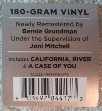 "This album was originally issued as Reprise #MS 2038 (6/71)" ℗ & © 2021, 1971 Warner Records Inc. Hype sticker reads: "180-Gram Vinyl. Newly Remastered by Bernie Grundman Under the Supervision of Joni Mitchell Includes California, River & A Case of you" The runout strings are etched.