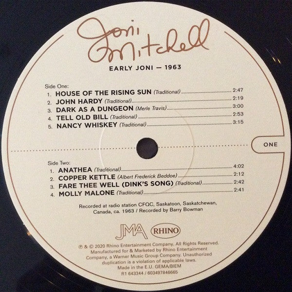 Front sticker: The First known Recording of Joni Mitchel Previously Unreleased featuring • 19-Year-old Mitchell at CFQC AM in Saskatoon, 1963 • A Newly Drawn Self-Portrait • Liners by Barry Bowman Recalling the Intimate Recording With Mitchell Rear sticker: Made in Czech Republic Packaged in a tip-on sleeve. Recorded at radio station CFQC, Saskatoon, Saskatchewan, Canada, ca. 1963 Mastering [... Bernie Grundman Mastering, Hollywood, CA ℗ & © 2020 Rhino Entertainment Company. Manufactured for & Marketed by Rhino Entertainment Company, a Warner Music Group Company, 777 S. Santa Fe Ave., Los Angeles, CA 90021. Made in the E.U.