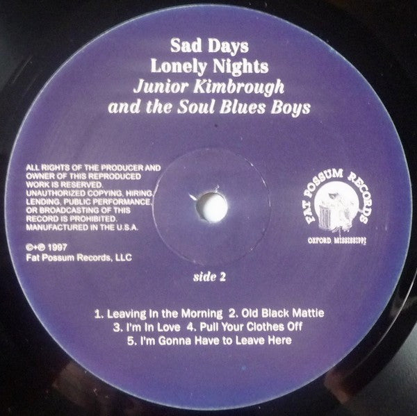 Recorded at Junior Kimbrough's juke joint, Chulahoma, MS, April 1993. Mixed at Quad Studios, New York, NY. ©+℗ 1997 Fat Possum Records, LLC Manufactured in the U.S.A. All songs published by Mockingbird Blues publishing Ltd (BMI) except "Old Black Mattie" traditional and "Crawling King Snake" published by La Cienega Music (BMI). Track durations are printed on the rear sleeve. The durations of A2, A4 and A5 are also printed on the face label for side A.