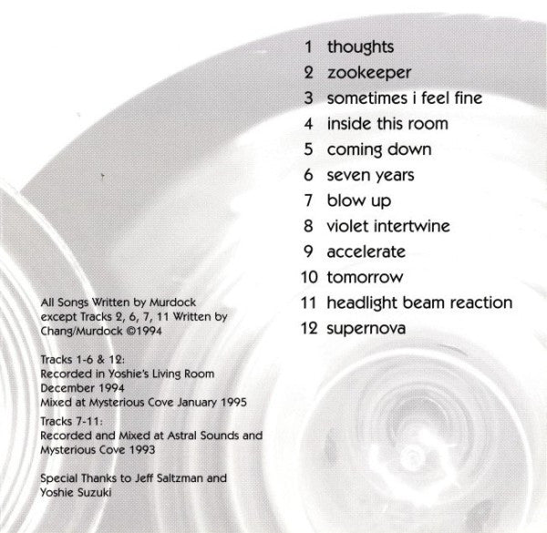 Tracks 1 to 6 & 12: recorded in Yoshie's Living Room, December 1994, and mixed at Mysterious Cove January 1995. Tracks 7 to 11: recorded and mixed at Astral Sounds and Mysterious Cove 1993.