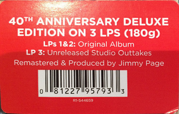 40th ANNIVERSARY EDITION ON 180g Vinyl Includes Kashmir & Trampled Under Foot Remastered & Produced by Jimmy Page ℗ & © 2015 Atlantic Recording Corporation, a Warner Music Group Company, Manufactured & Marketed by Warner Music Group, USA.