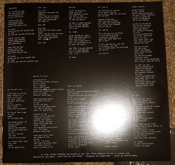 Black vinyl reissue from 2017 and after (date unclear). Comes in gatefold sleeve. Includes inner sleeve with lyrics, double-sided poster and card for a free mp3 download of the album. Back cover: © 2014 Captured Tracks Records. Labels: ℗ & © 2014 Captured Tracks Records. A division of Omnian Music Group. All songs written, performed and recorded at Jizz Jazz Studios Brooklyn, NY 11221 in October 2013 'Mastered At' credit and pressing plant identified through runouts.