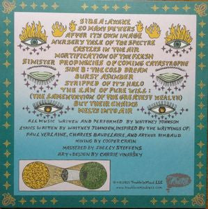 "Lyrics written by Whitney Johnson, inspired by the writings of: Paul Verlaine, Charles Baudelaire, and Arthur Rimbaud" Side A ends in a recorded locked-groove. Released in an edition of 500 copies on mixed color vinyl, includes an mp3 download coupon.