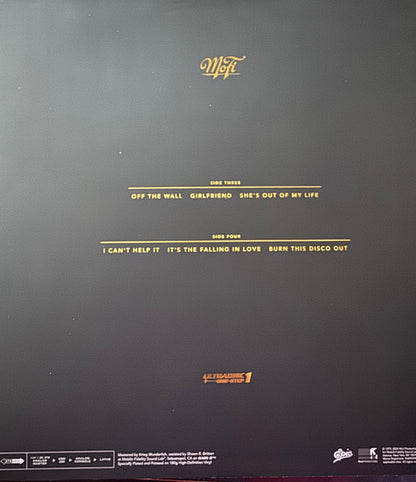 1/4" / 30 IPS analog master to DSD 256 to analog console to lathe This release contains the single mixes of "Rock With You" and "Get On The Floor" as found on later LP and CD pressings. This release does not contain the original LP mixes of the aforementioned tracks. 1979 Landmark Presented in Audiophile Sound for the First Time: Mobile Fidelity’s UltraDisc One-Step 180g 45RPM 2LP Box Set Explodes with Energy, Plays with Superb Clarity and Detail, Is Strictly Limited to 6,000 Numbered Copies Runouts are etched. Containes approx. 12x24" Poster with Gatefold Artwork and Lyrics