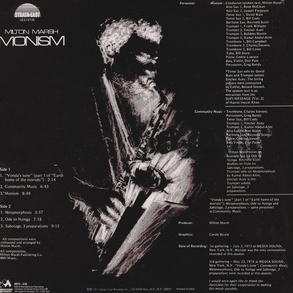 Date of Recording: 1st gathering - July 3, 1973 at MEDIA SOUND, New York, N.Y. Monism was the only composition recorded at this session. 3rd gathering - May 23, 1974 at MEDIA SOUND, New York, N.Y. "Vonda's tune", Community Music, Metamorphosis, Ode to Nzinga and Sabotage, 3 preparations were recorded at this session. Fully licensed reissue on Manufactured Recordings.