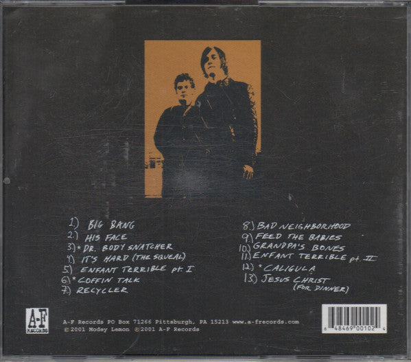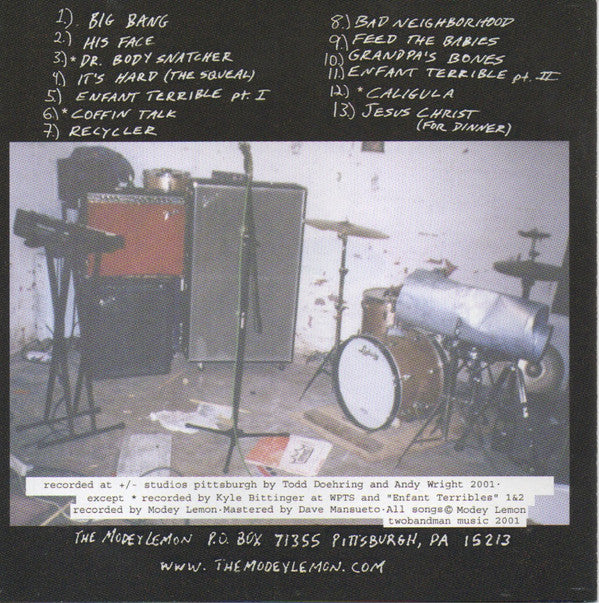 Track 13 ends at 4:15. Approximately 49 seconds of silence follows. An unnamed song begins 5:04 into track 13 and finishes it out. On spotify this track is called "Narrow Home". Recorded at +/- Studios Pittsburgh 2001 except 3, 6, 12 recorded at WPTS and "Enfant Terrible" 1 & 2 recorded by Modey Lemon. twobandman music 2001 (c) 2001 Money Lemon (p) 2001 A-F Records Standard jewel case with six panel insert.