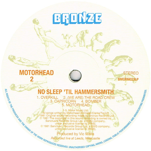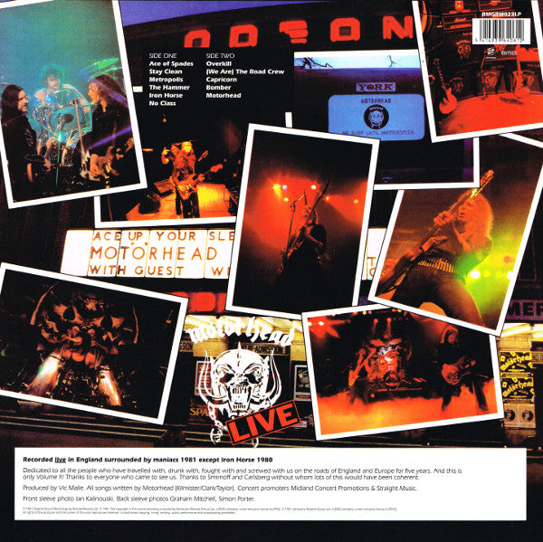 Printed inner sleeve. Recorded live in England surrounded by maniacs 1981 except "Iron Horse" 1980. Recorded live at Leeds, Newcastle Includes code to download album in FLAC OR MP3 ℗ 1981 Original Sound Recordings by Bronze Records Ltd. ℗ 1981 The copyright in this sound recording is owned by Sanctuary Records Group Ltd. © 1981 Sanctuary Records Group Ltd. Although the record credits all songs to Motorhead, the song "Motorhead" was written solely by Lemmy when he was a member of Hawkwind