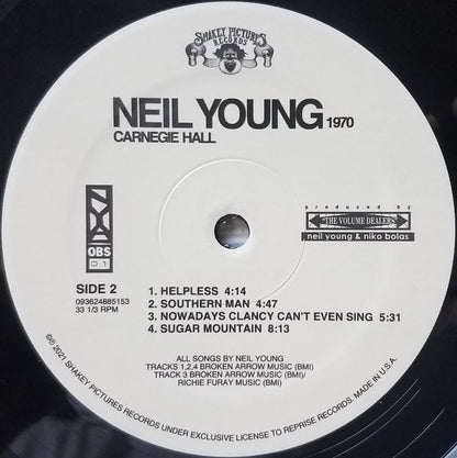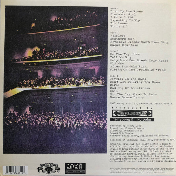 Hype sticker: The legendary solo acoustic show Carnegie Hall, New York December 5, 1970 [This date is incorrect 22 songs on 2 LP’s Sleeve: Recorded live at Carnegie Hall, N.Y.C. December 4, 1970 From the original Non-Dolby Scotch 1 inch to ATR 1/4 inch tape. Mixed and edited at Capitol Studio 3 from October 26-28, 2020. Final editing for both on election day November 3, 2020 ©℗ 2021 Shakey Pictures Records Made in U.S.A.