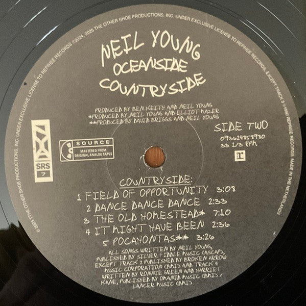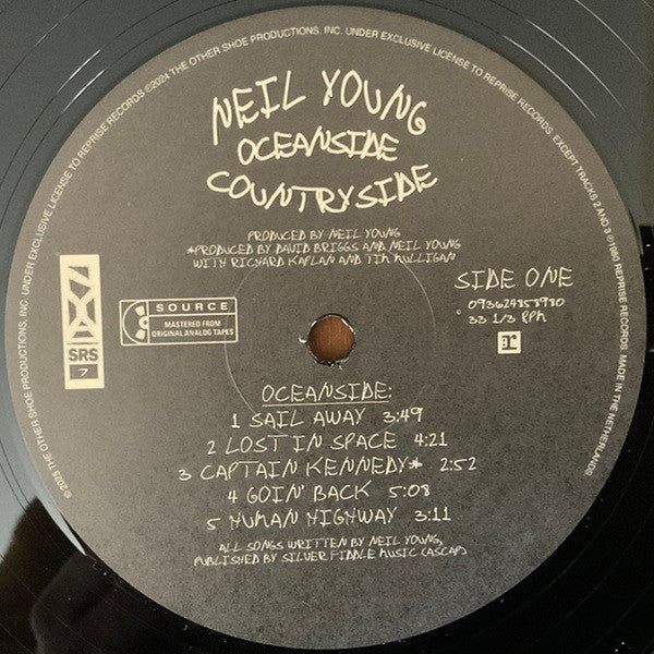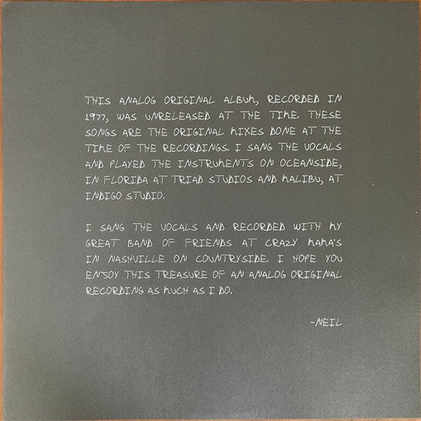 Includes a 4-page lyrics booklet and a single-sided Neil Young Archive promo insert. Hype sticker: The unreleased 1977 album preceding "Comes A Time" First time on vinyl Mastered from original analog tapes Reprise Records. A Warner Music Group Company. 777 S. Santa Fe Ave., Los Angeles, CA 90021, 1633 Broadway, New York, NY 10019-6708. ©2025 The Other Shoe Productions, Inc. under exclusive license to Reprise Records. ℗2024, 2025 The Other Shoe Productions, Inc. under exclusive license to Reprise Records. ℗ 1980 Reprise Records. Made in the Netherlands. All songs... © Silver Fiddle Music (ASCAP) except: "Dance, Dance, Dance" © Broken Arrow Music Corporation (BMI), "It Might Have Been"... © Ominid Music (BMI) / Lancer Music (BMI) A1. Recorded at Triad Recording Studios, Ft. Lauderdale, 9/12/1977 A2. Recorded at Triad Recording Studios, Ft. Lauderdale, 9/15/1977 A3. Recorded at Indigo Ranch Recording Studio, Malibu, 8/11/1976 A4. Recorded at Triad Recording Studios, Ft. Lauderdale, 9/16/1977 A5. Recorded at Triad Recording Studios, Ft. Lauderdale, 9/14/1977 B1. Recorded at Crazy Mama's, Nashville, 5/3/1977 B2. Recorded at Crazy Mama's, Nashville, 5/3/1977 B3. Recorded at Quadrafonic Sound Studios, Nashville, 12/11/1974 Saw (Broken Arrow Studios) B4. Recorded at Crazy Mama's, Nashville, 5/3/1977 B5. Recorded at Indigo Ranch Recording Studio, Malibu, 8/11/1976 and recorded at Triad Recording Studios, Ft. Lauderdale, 9/4/1977 Analog remastering... at Bernie Grundman Mastering