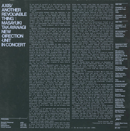 Comprised of recordings of a September 5, 1975 concert by the New Direction Unit at Yasuda Seimei Hall in Tokyo’s Shinjuku district.