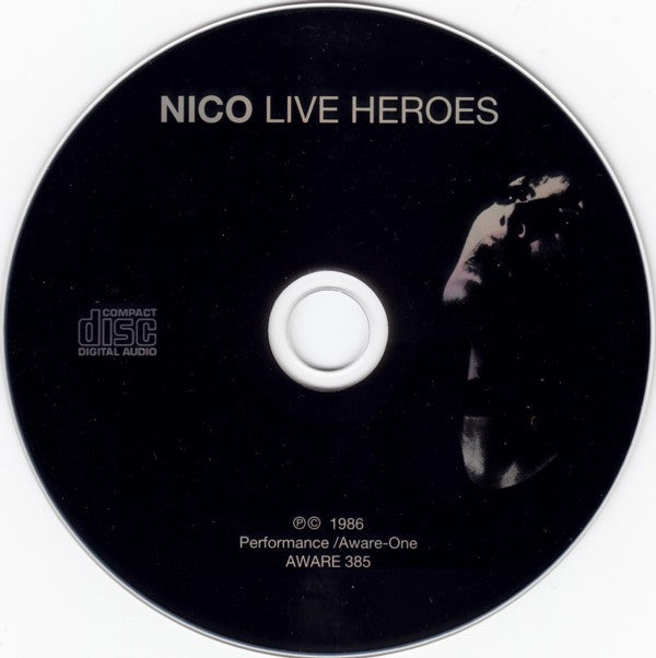 Compilation of live recordings and the 1982 single of Nico & The Invisible Girls "Procession / All Tomorrow Parties". ℗© 1986 Performance/Aware-One (on CD) ℗© 1986 Performance/Aware-One Recordings (on back sleeve) Dist. by Aware-One Recordings Licensed by LSR, New York Track details from Nico's web-site: 1, 5, 6 - Live København Saltlageret 1982/10/05 2 - From 1/2 Records single A-side (Catalog# 1 2 REC 112) 4 - From 1/2 Records single B-side (Catalog# 1 2 REC 112) 3, 7 - "Behind the Iron Curtain" LP (surface noise). "The End" Spoken intro edited. Track 5 is mistitled here as "Secret Side". It is in fact "Valley of the Kings". Arranged by and Performer credits for track 2 are possibly the same as with track 4 (not appearing on this release, but in other entries for "Live Heroes").