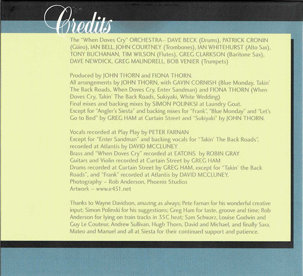 Thanks to Wayne Davidson, amazing as always; Pete Farnan for his wonderful creative input; Simon Polinski for his suggestions; Greg Ham for taste, groove and time; Rob Anderson for lying on train tracks in 35C heat; Sam Schwarz, Louise Godwin and Guy Le Couteur, Andrew Sullivan, Hugh Thorn, David and Michael, and finally Sara, Mateo and Manuel and all at Siesta for their continued support and patience. 6-panel digipak. Durations not mentioned on the release, instead taken with software.