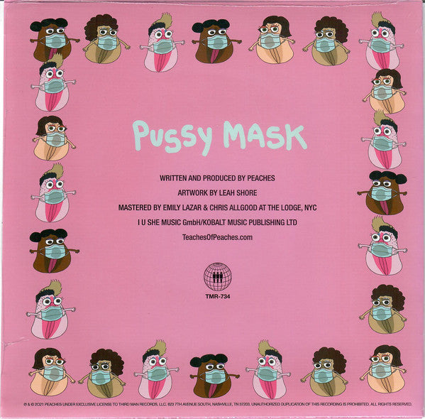 Front cover of this version has a 1 in the bottom corner of the artwork. Etching on back of disc is the Third Man Records logo. Inside sleeve is printed in color with a pattern of face masks. The version with the 2 in the artwork is [r19455241. Peaches says, “Because of the pandemic, our collective anxieties unite us more than ever. Even though it may not affect each one of us the same way, we all have similar base concerns. A serious reminder that we are all in this together. I wanted the song to be absurd and fun but also a reflection of our concerns. The humor shines some light into our dark, confusing, and frustrating reality.”