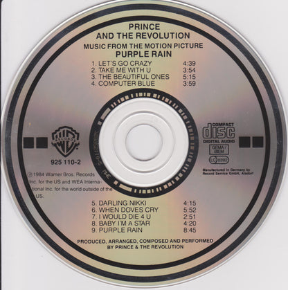 Back tray insert: Manufactured in Germany by Record Service GmbH, Alsdorf. Pressé en Allemagne par Record Service GmBH, Alsdorf [the line is a relict from previous editions: the matrix indicates the actual company is Warner Music Manufacturing Europe Spines: 7599-25110-2 Prince & The Revolution/Music From Purple Rain Disc: Music from the motion picture Purple Rain 925 110-2 ℗ 1984 Warner Bros. Records Inc. Manufactured in Germany by Record Service GmbH, Alsdorf [located on the right hand side, on later editions the line changed and moved to the bottom centre Trilingual copyright text around outer rim of CD includes typos - "All rights of the producer and of the owner of the word [sic. read work reproduced." - as well as other errors in the French text. The only date which appears is the original 1984 release date. The mould SID code indicates an issue from 1994 onwards Similar releases: [r=2426656 (Record Service Alsdorf pressing, with "France WE 851" on back tray insert) [r=4288849 (same artwork / matrix indicates the manufacture in 1999 / 'Made in Germany' on bottom centre )