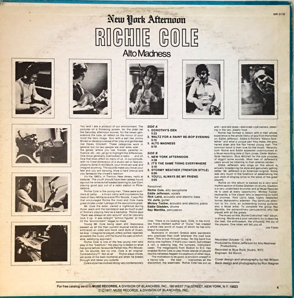℗© 1977, Muse Records, A Division Of Blanchris, Inc. Recorded October 13, 1976 Produced [... for Alto Madness Productions Recorded at Blue Rock Studio, NYC. A1, A2, A3, B1, B2: Alto Madness Music BMI B3: Mills Music ASCAP B4: Snow Ride Music BMI